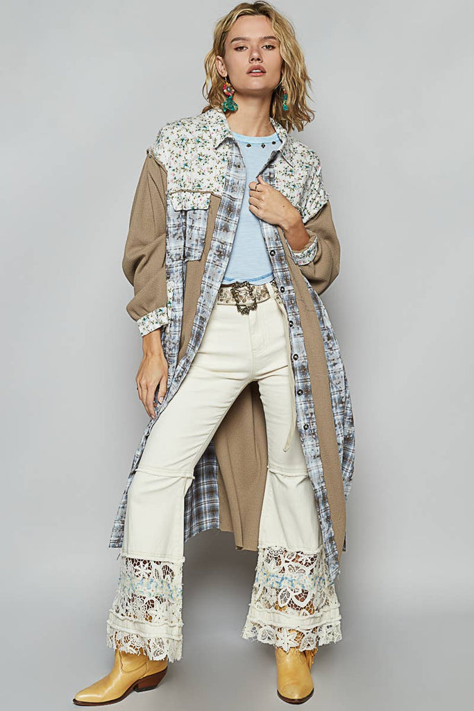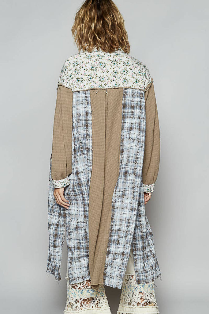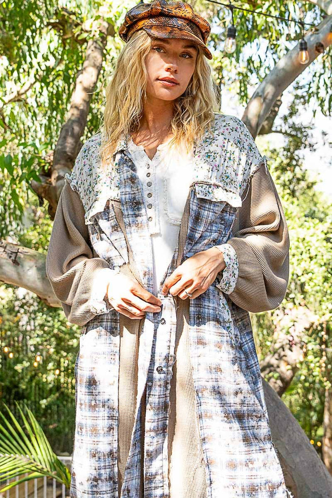 Designed in placket jacket, balloon sleeve, relaxed fit top in plaid and thermal mix with frayed edge detail pointed floral pattern.