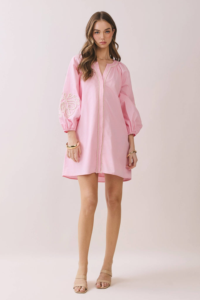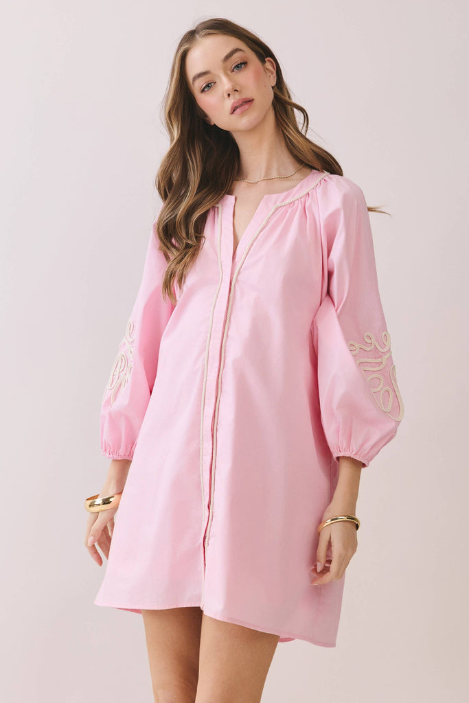 Embroidered Sleeve Baby Doll Button Down Mini Dress: BABY PINK