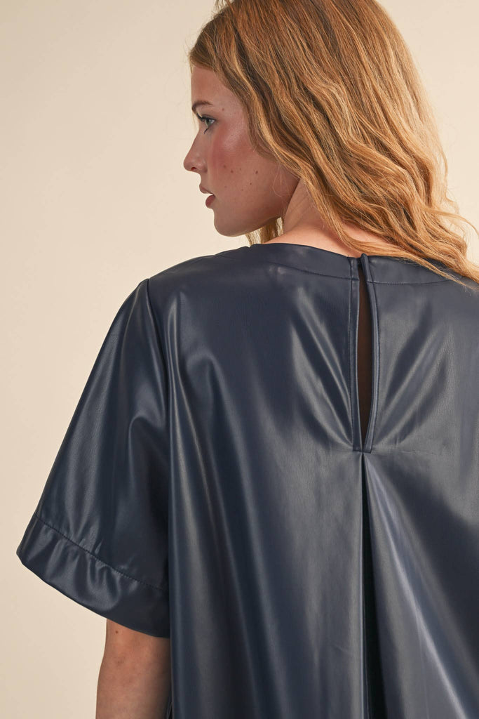 + Flared short sleeve swing mini dress + Faux leather + Flared short sleeves + Pleated back detail + Keyhole back with button closure + Pockets + Lined + Model is 5' 7" 30-24-34.5 and wears a S