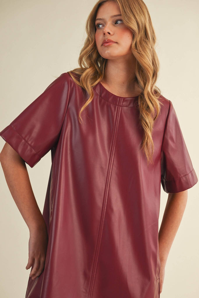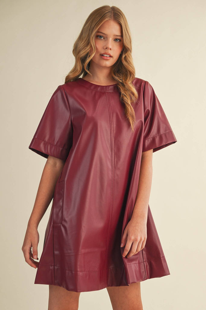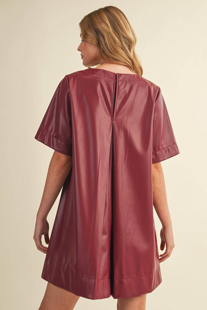 + Flared short sleeve swing mini dress + Faux leather + Flared short sleeves + Pleated back detail + Keyhole back with button closure + Pockets + Lined + Model is 5' 7" 30-24-34.5 and wears a S
