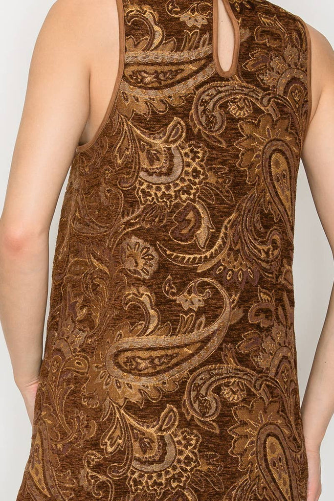 - Camel suede binding detail on neck line, arm hole and bottom hem