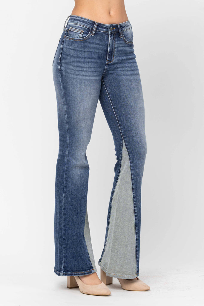 The Midrise Inseam Panel Flare jeans from Judy Blue are perfect for fall/winter casual and everyday wear. Made from a blend of 94% cotton, 5% polyester, and 1% spandex, they offer a comfortable fit. The jeans feature a medium wash and a solid pattern. They are designed to be hand washed and have a front rise of 10" and an inseam of 33 1/2". Judy Blue has been creating quality denim since 1999, merging unique wash techniques with a body-hugging fit. Enjoy the perfect blend of timeless appeal and a modern twist with these jeans.