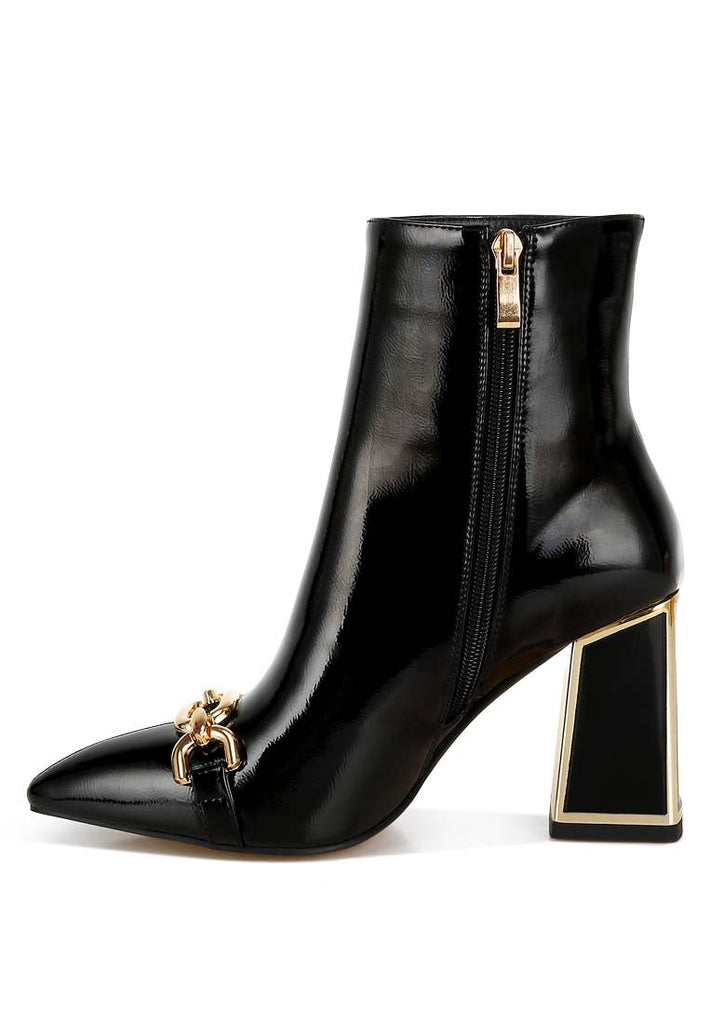 The shiny boots have a patent faux leather upper which is durable while the metallic chain detail accentuates the visual aesthetic of the boots. The metallic detail on the block heels is stylish while the comfortable cushion insoles cut strain and offer a relaxed fit for the feet.