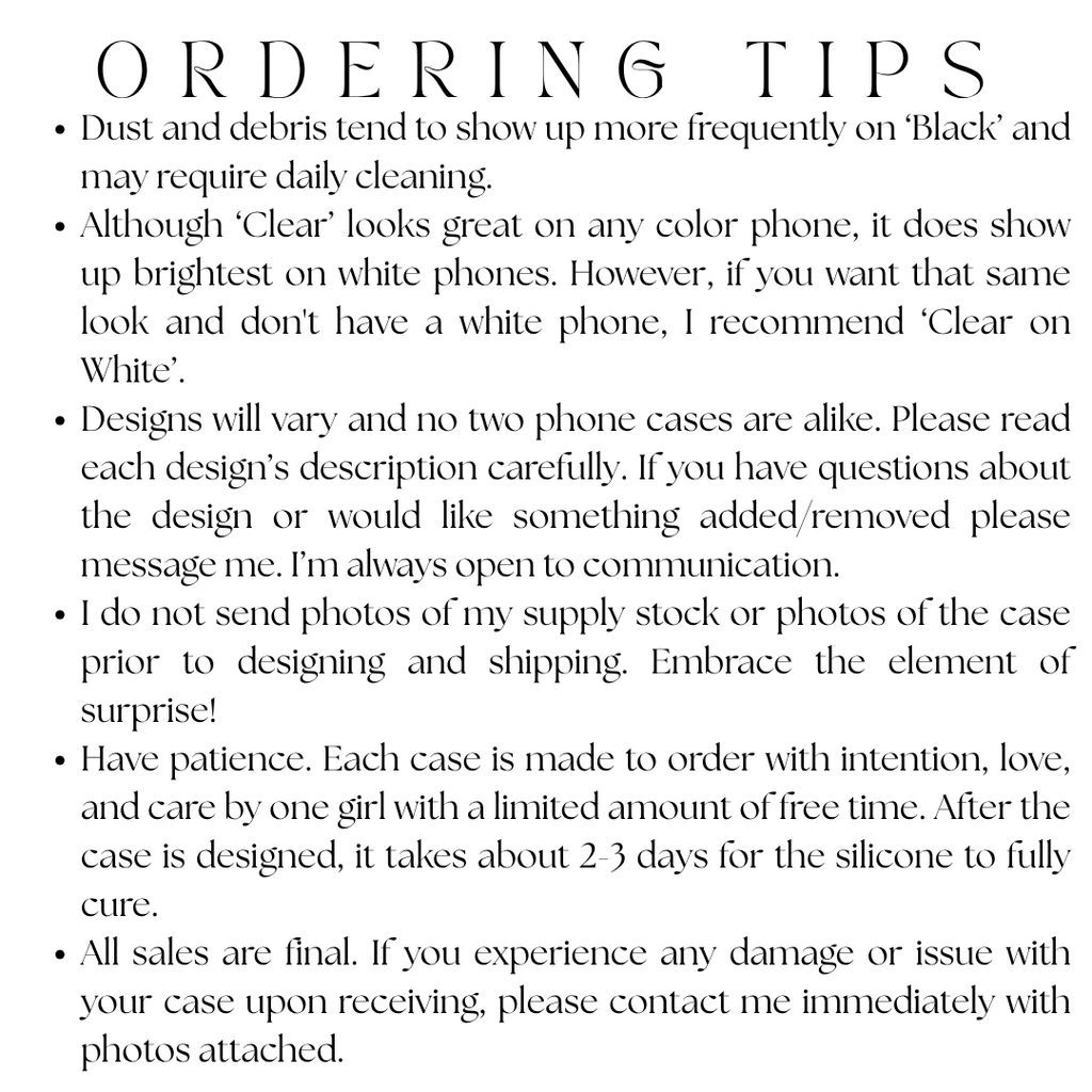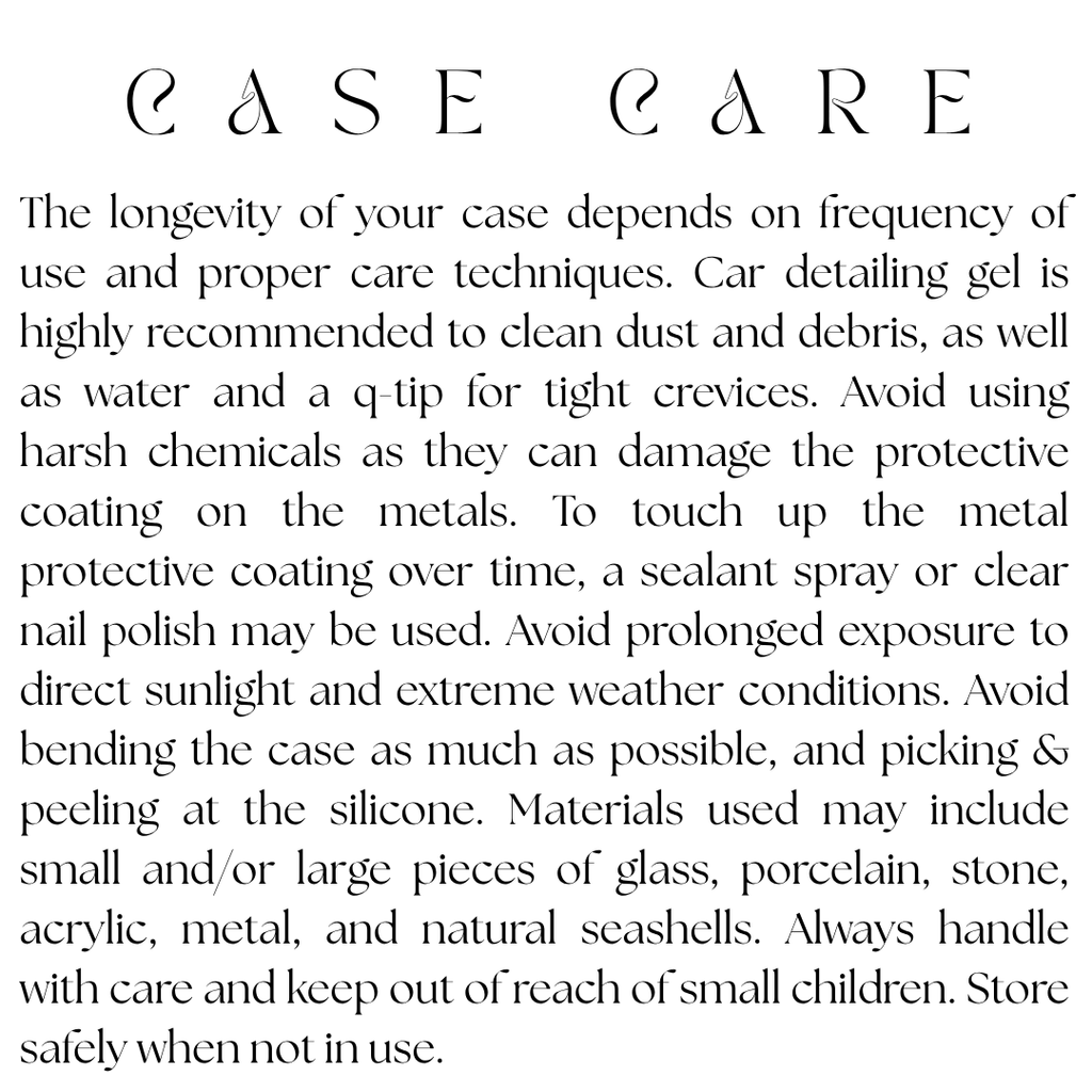 • Each case is meticulously handcrafted, made-to-order, and one-of-a-kind. Designs will vary.