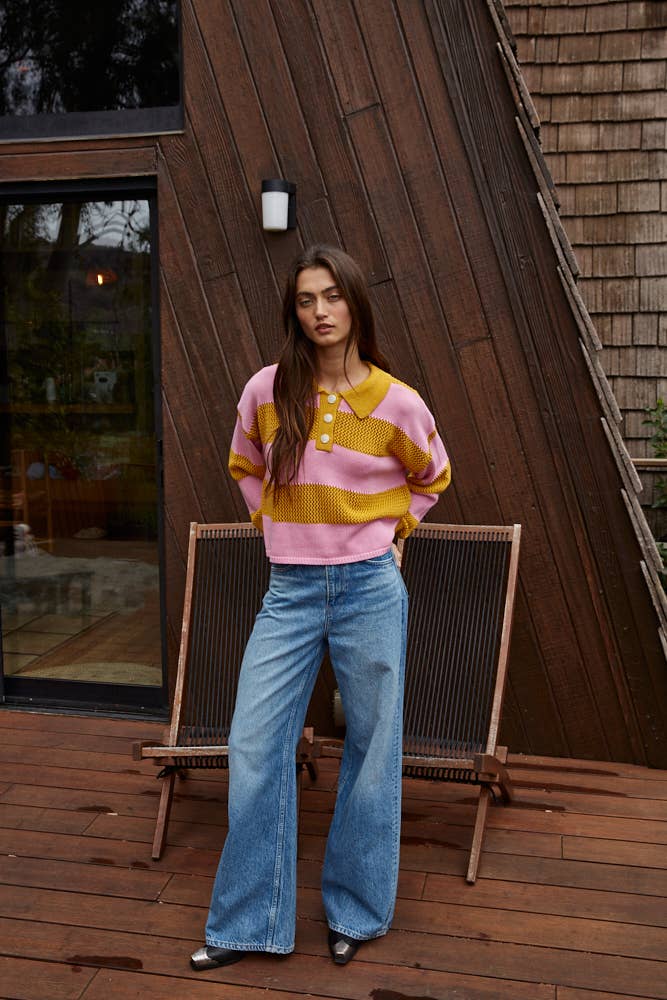 Knit Sweater Cotton Acrylic Collar Neck Top: Mustard Pink
